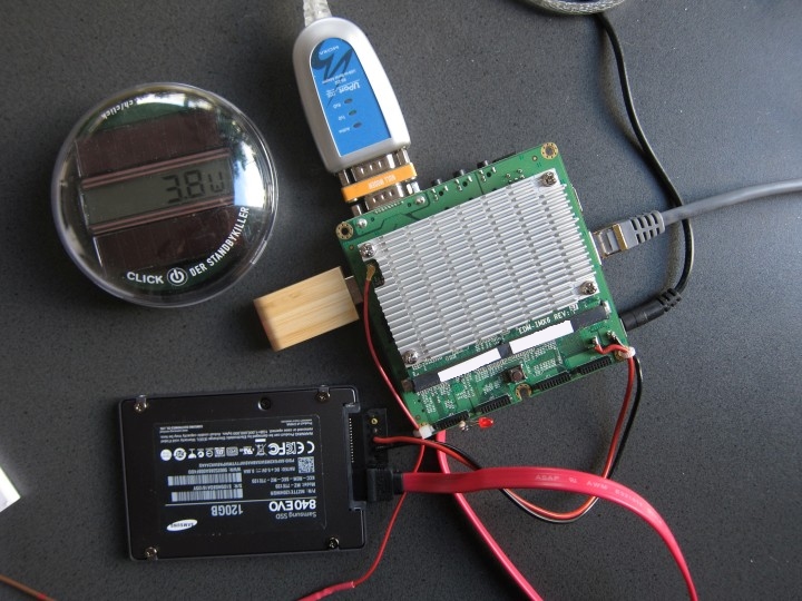 This picture shows the wandboard quad, attached to a 120GB SSD. The power monitor (round thing) measures the Wattage at the mains: 3.8 Watt while running Fedora/XFCE.