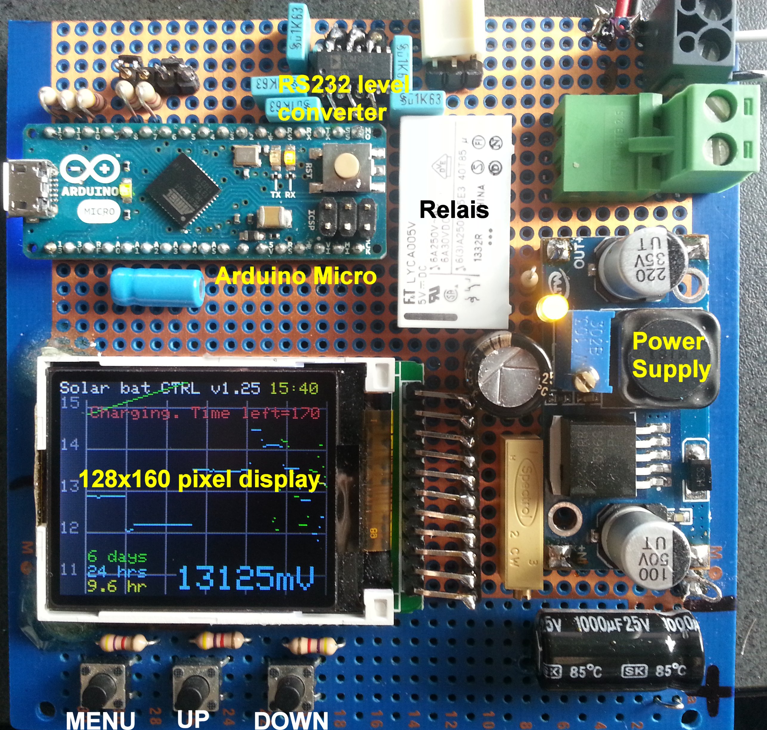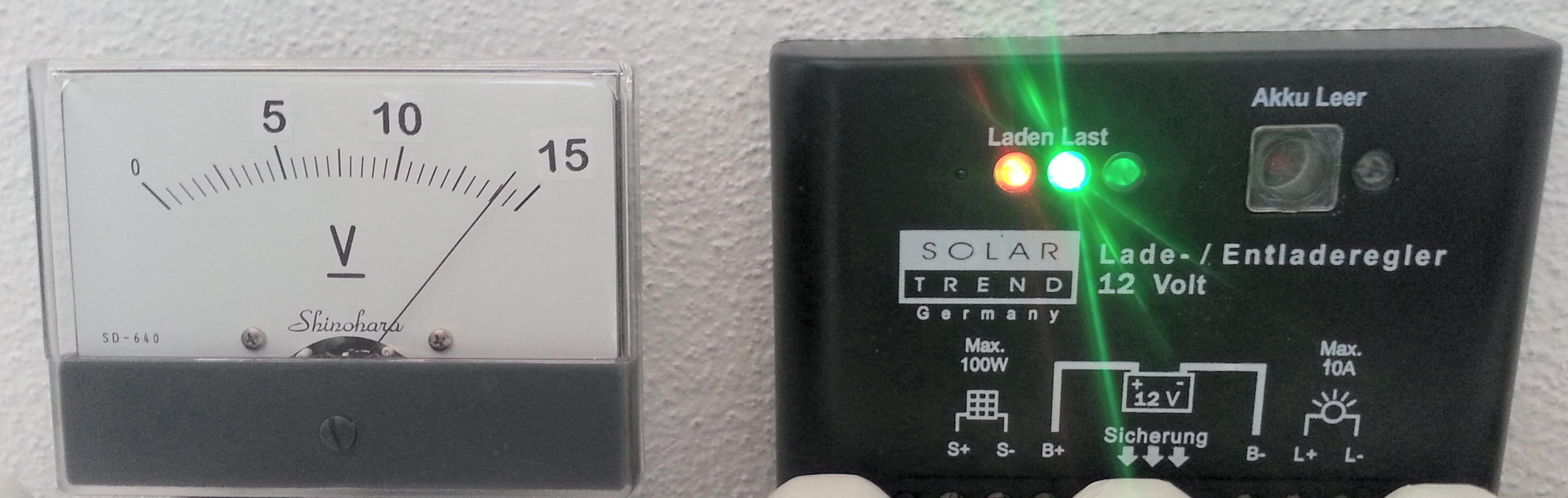 Solar Trend controller - art.Nr. 03155 from www.sued-solar.de (website defunct) 12Vdc, power consumption: 4mA 120mm x 80mm x 25mm overload protection: 13.8 - 14.4V max load: 10A discharge protection: 11.1V Temp sensor for battery temp compensation |
