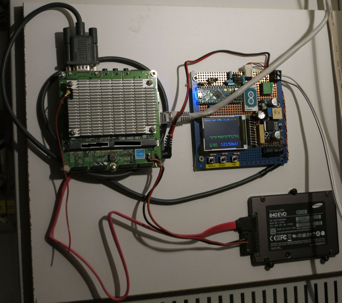 This wandboard Quad (32bit ARM) based microserver is solar powered thru a PV panel on my roof. There is a backup power source in case the lead-acid batteries get drained. This is controlled thru an Arduino that measures the battery voltage. It is connected to the Wandboard thru a serial connection to facilitate logging, shown in these plots: