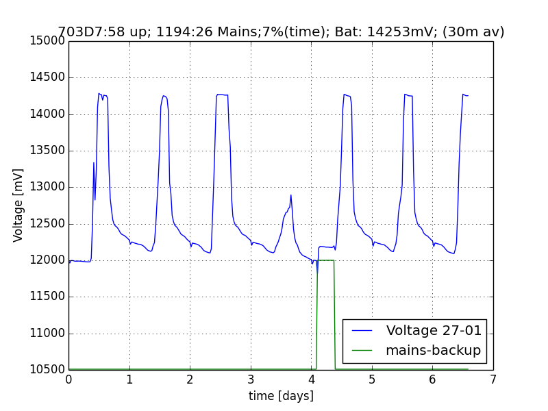 ![]() Voltage Plot last 7 days (one averaged sample every 30 mins) |